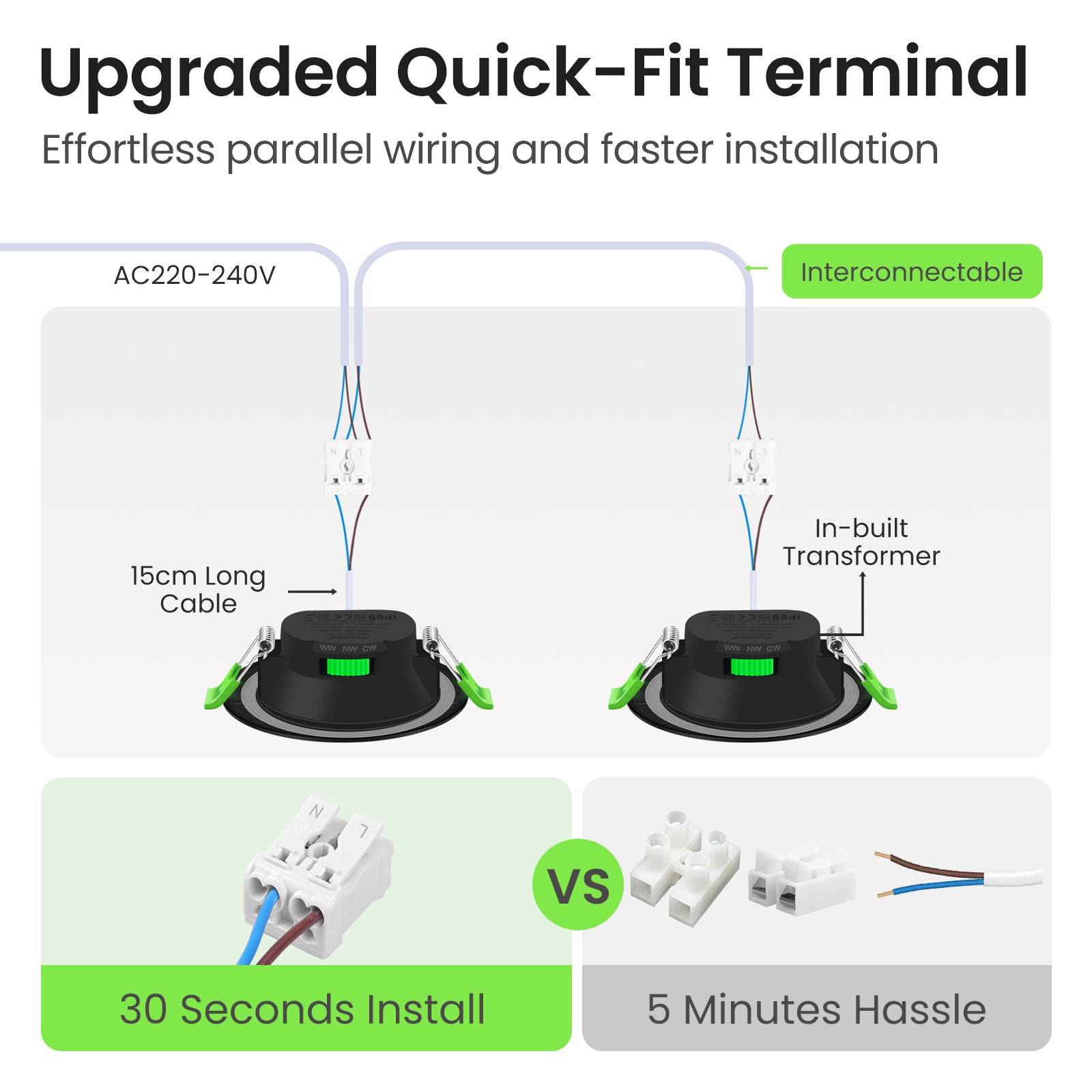 💡【Easy Install】 Low profile recessed ceiling lights with only 30mm installation depth, suitable for retrofit and new decoration. Diameter Ø 85mm, required ceiling cutout size Ø 67-75mm. Directly connected to 230V, no transformer required. Cable length 15cm.