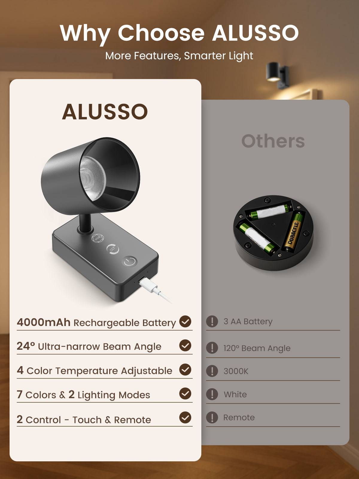 ✅【Unique Anti-glare Rechargeable Wall Sconce】Our wireless wall light design with only a 24°beam angle, setting it apart from other wall lights on the market. This design effectively prevents glare and provides 870LUX brightness at a distance of 1m, making it the perfect choice for reading at night without disturbing your family's rest and protecting your eyes. Choose our wall lamp for the best lighting experience.