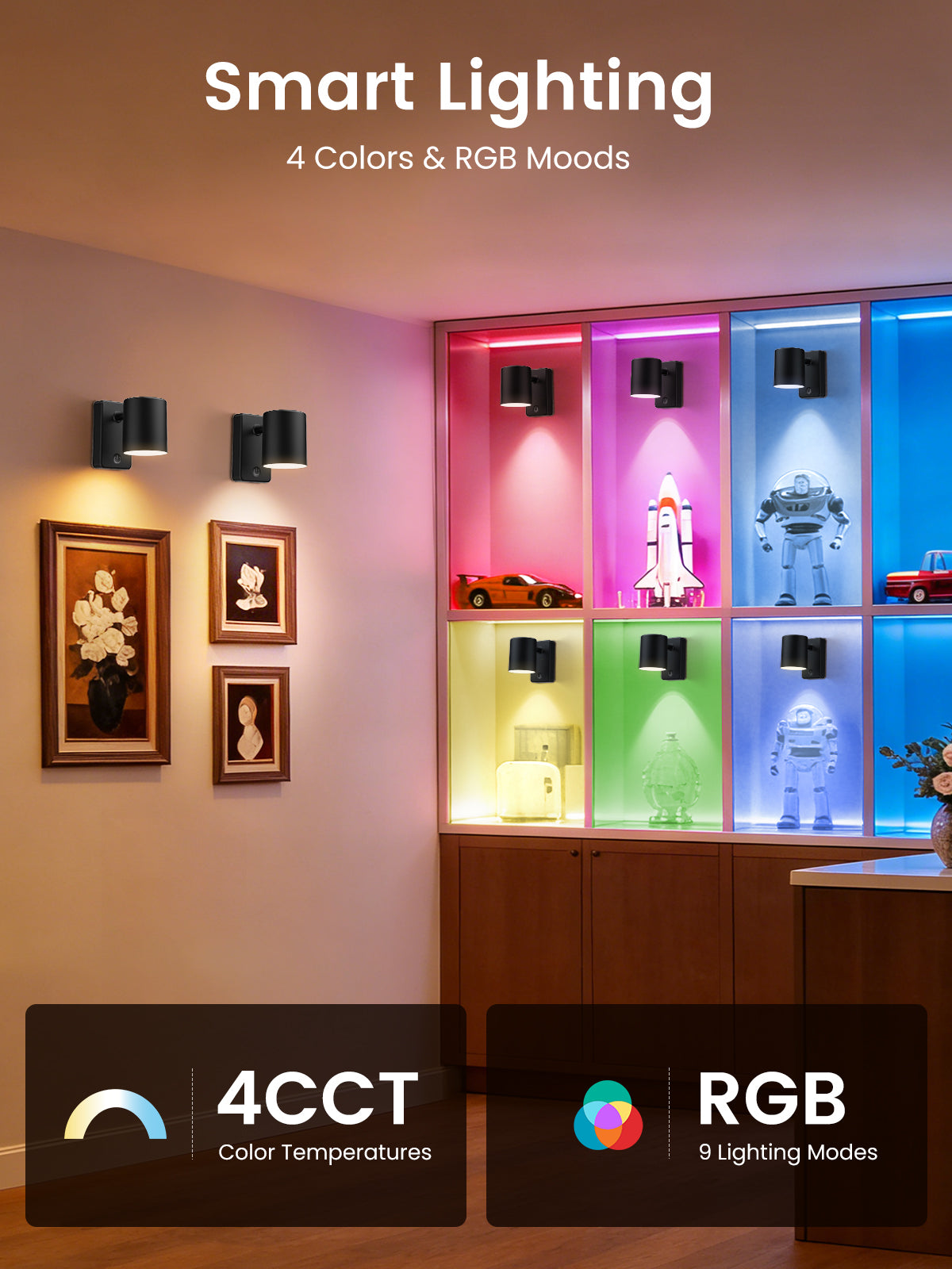 ✅【Wall Sconces with 4CCT & DIM & RGB】Led wall lamp with 4 Color temperature selectable (3000K/4000K/5000K/6000K) to suit all occasions. 10%-100% smooth dimmable brightness work for each lighting color temperature. Additionally, 7 basic lighting colors RGB function with 2 ambience modes (Romantic Breathing & Colorful Flashing), our wall lights will bring you endless fun and a wonderful atmosphere at night.